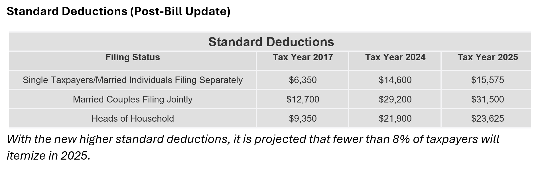 To benefit from itemized deductions, eligible expenses must now exceed $31,500 for married couples filing jointly and $15,575 for single taxpayers. Common itemized deductions include mortgage interest, state and local taxes, unreimbursed medical expenses, and qualified charitable donations. Certain limitations apply to each of these categories, so be sure to check with a CPA or Enrolled Agent to confirm which expenses qualify for itemizing.